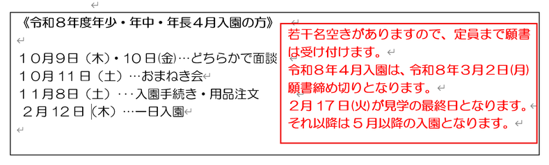 令和7年度満3歳児11月~3月と令和8年度4月に向けて入園を